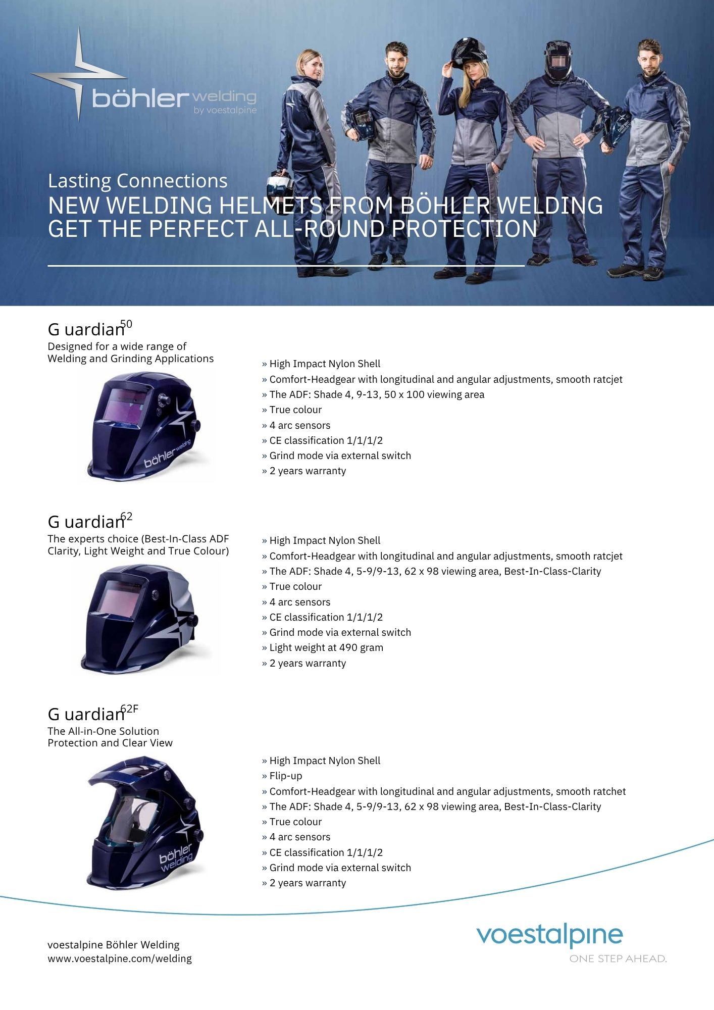 BÖHLER Guardian helmets are designed for a wide range of welding and grinding applications. In the focus of product development is the welders' expectation for high-quality, comfortable and durable products. This means light weight products down to 480 grams with a robust headgear covered by soft sweatbands and highest ADF clarity with true colour technology.